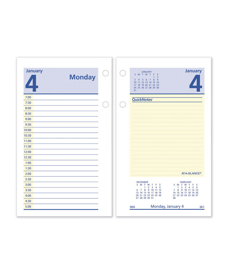 Yellow highlighted section for notes and to-do's. One day per two-page spread ruled for appointments; full weekends. Past, current and future months reference. Monthly tabs for easy referencing of dates; easy snap-in feature. Loose-leaf pages are punched and fit two-ring, E17-style calendar bases.