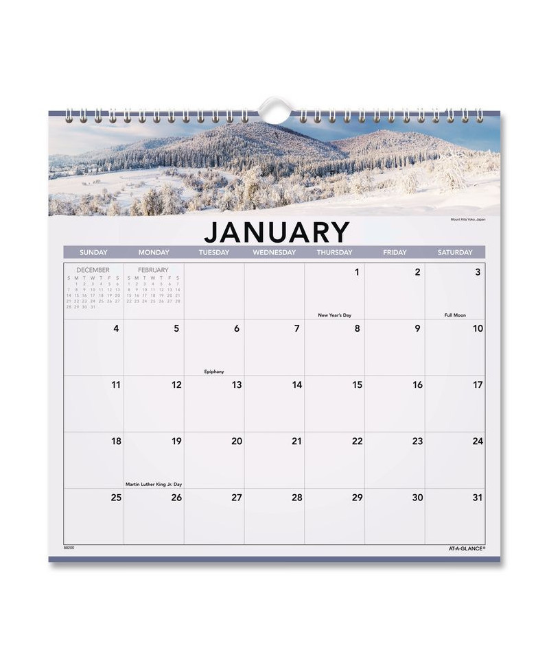 Explore a different picturesque landscape each month. Features full-color photos. One month per page with unruled blocks. Past and future months reference; federal holidays highlighted. White wirebound with hanging loop. Printed on high-quality paper with superior ink bleed resistance.