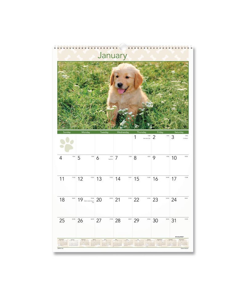 Smile with a different adorable puppy each month. One month per page. Full-year calendar reference; federal holidays highlighted. Bonus page: current year reference calendar; chipboard backing; wirebound with hanging loop.