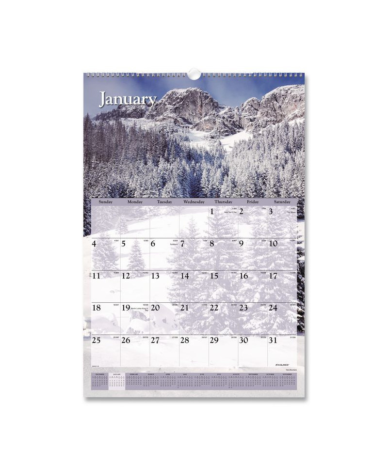 Escape with a stunning scenic image each month. Features full-color photos. One month per page with unruled blocks. Full-year calendar reference; federal holidays highlighted. Bonus page: current year reference calendar. Chipboard backing; white wirebound with hanging loop. Printed on high-quality paper with superior ink bleed resistance.