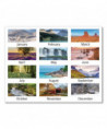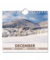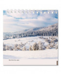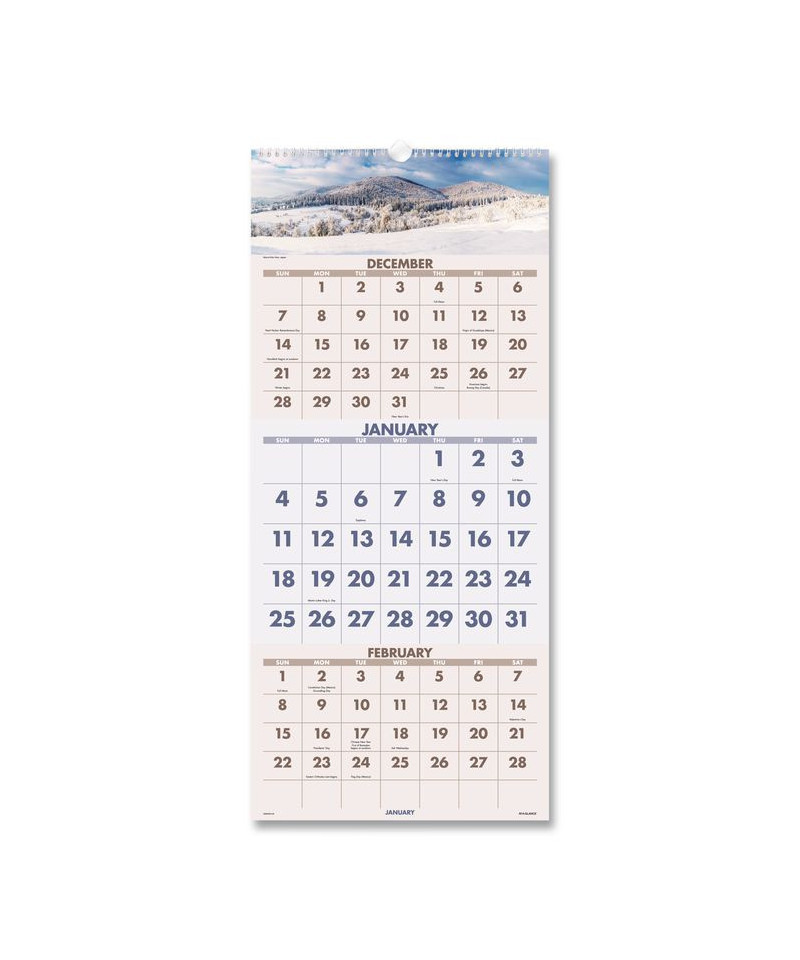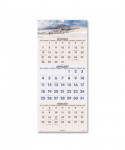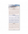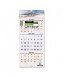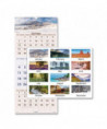 Vertical three-month view with scenic photography on each page. Features full-color photos. Three months per page. Bonus page: current-year reference calendar. Chipboard backing; white wirebound with hanging loop.