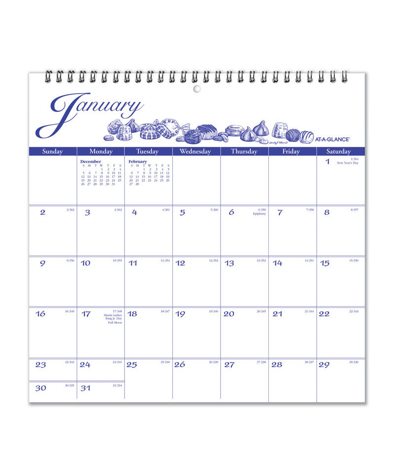 Enjoy a new illustration each month. One month per page with unruled blocks; past and future months reference. Framed with heavyweight gray backboard; wirebound with center hole punch. High-quality paper features superior ink bleed resistance