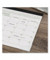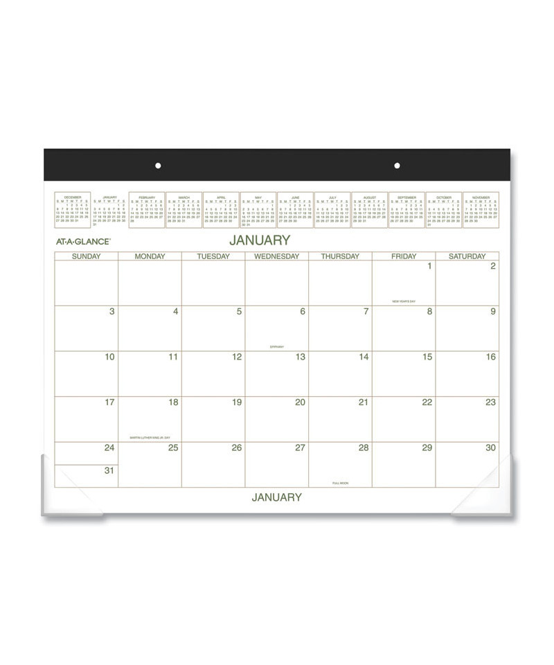 Desk pad covers a 12 month date range January December. High-quality paper features superior ink bleed resistance. One month per page format has unruled daily blocks for open scheduling and a full year of reference calendar blocks. Special features include a 2021 reference calendar and two clear corner protectors to make sure pages like flat. Calendar has a wide black headband and two holes for optional wall hanging. Pages measure 22" x 17".