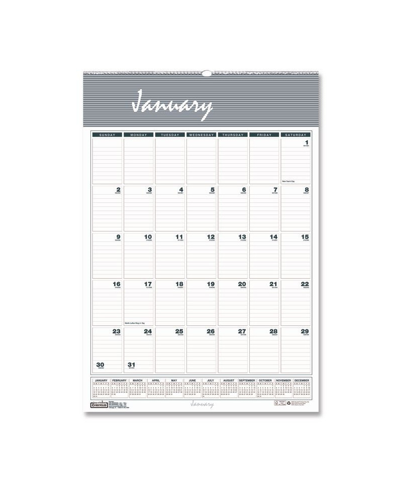Ruled daily blocks keep notations neat. Full-year reference calendar aids in planning throughout the year. Neutral graphics match any décor. Wirebound with a full chipboard backer and a sturdy wire hanger. Made entirely of recycled materials.