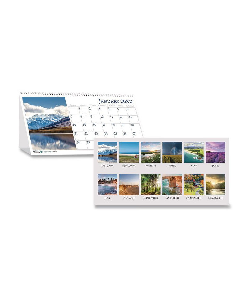 Beautiful, full-color scenic landscapes on each month. Stand-alone, tent-design calendar is perfect where desk space is limited. Spiralbound at the top for easy reference of future and past months. Full-year reference calendar on the back of each page. Made entirely of recycled materials.