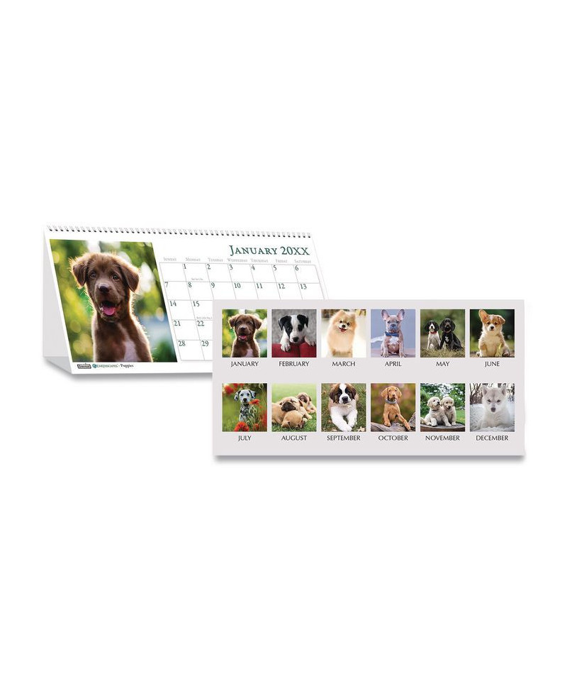 Brighten your office with adorable puppy images that change every month. Stand-alone, tent-design calendar is perfect where desk space is limited. Full-year reference calendar on the back of each page. Spiralbound at the top for easy reference of future and past months. Made entirely of recycled materials.