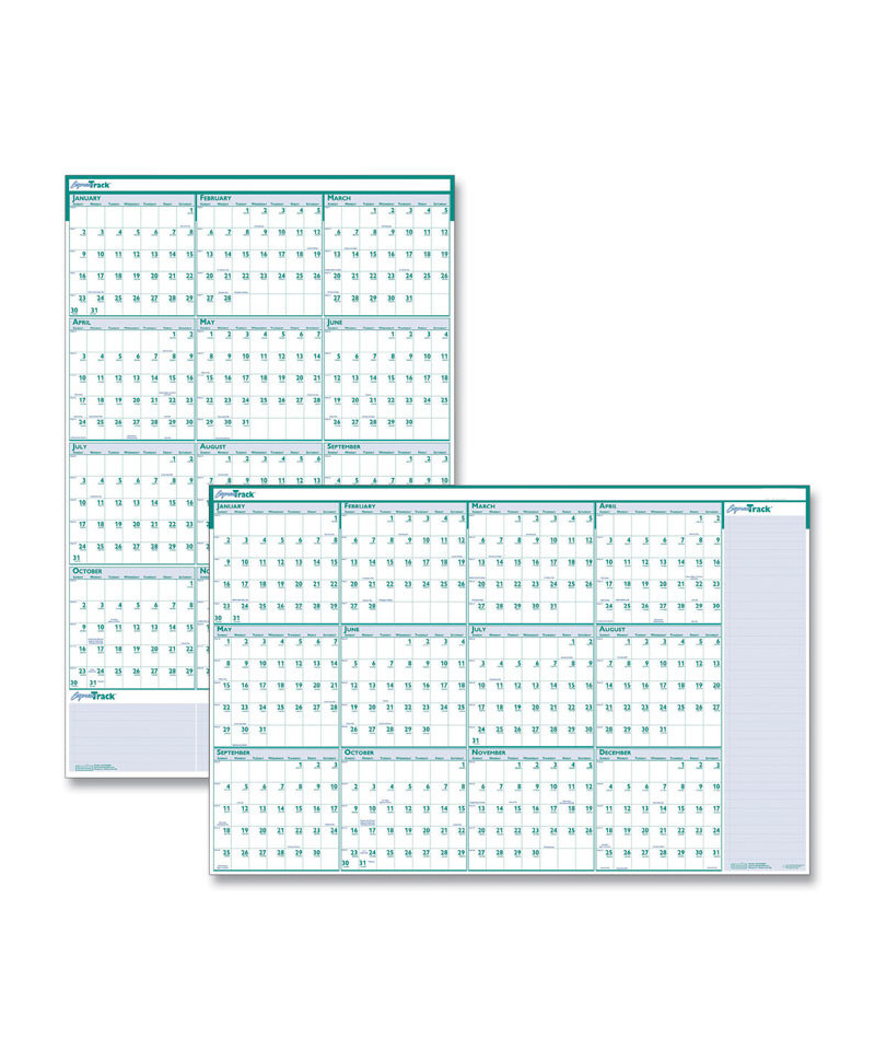 Reversible yearly wall planner features a horizontal format on one side and a vertical format on the reverse to best fit any workspace. Heavy-laminated write-on, wipe-off surface erases clean with a damp cloth, making it easy to change notes and plans. Teal printing on white background helps your notes stand out. Generous open note space for business goals and priorities and numbered weeks. Includes one black, water-soluble marker and hanging tabs. Calendar is printed on 100% recycled paper with soy inks.