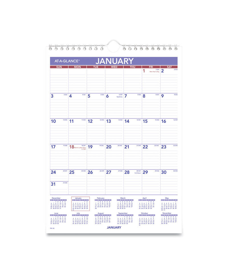 Add to cart Wirebound Monthly Desk/Wall Calendar, 11 x 8 1/2, 2019 $13.07 One-month view combined with a full page of space for notes and reminders. One month per two-page spread with unruled blocks; notes space on top...