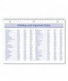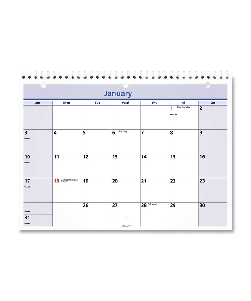Yellow highlighted section for notes and to-do's. One month per two-page spread with unruled blocks; shaded weekends; QuickNotes® section on top page. Current, two past and two future months reference; federal holidays highlighted. Wirebound and three-hole punched for binder use or hanging. Printed on high-quality paper with superior ink bleed resistance.