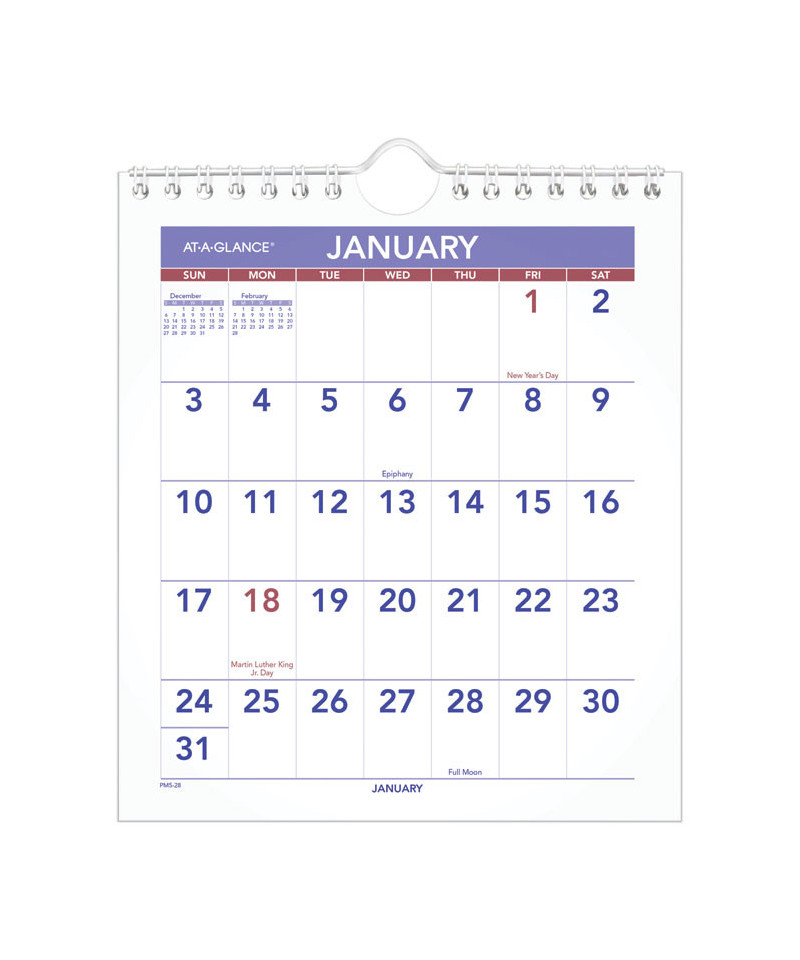 Perfect for small spaces. Displays one month per page with past and future month reference. Wirebound at the top. Unruled blocks for appointments and notes. Printed on high-quality paper with superior ink bleed resistance.