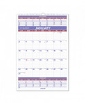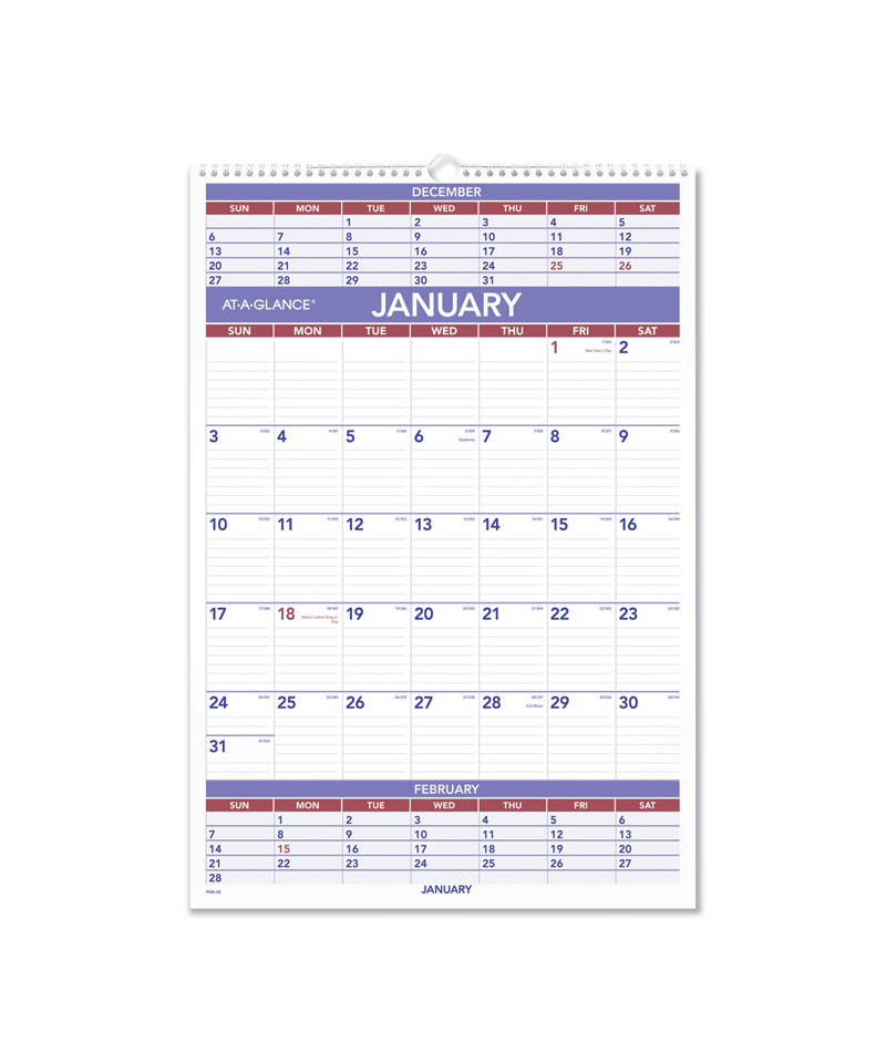 Three-month view with plenty of space for planning in the current month. Three months per page: large current month with ruled blocks, condensed past and future months. Federal holidays highlighted. Bonus page: six future months. Chipboard backing; white wirebound with hanging loop. Contemporary design with plenty of writing space. Printed on high-quality paper with superior ink bleed resistance.