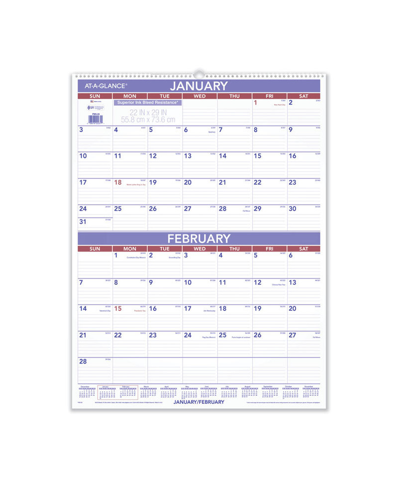 Displays two months at a time for easy planning. Two months per page (six pages total) with ruled blocks. Full-year calendar reference; federal holidays highlighted. White wirebound with hanging loop. Printed on high-quality with superior ink bleed resistance.