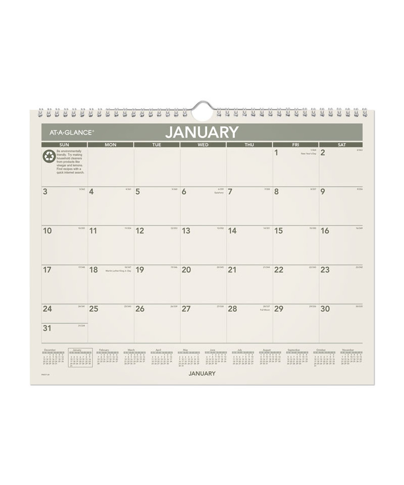 Plan ahead wisely with a recycled calendar. Tips for "green living" each month. One month per page with full-year calendar reference. Wirebound with hanging loop. Durable backboard provides a sturdy writing surface.
