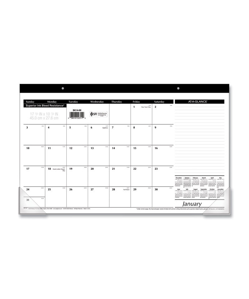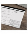This compact desk pad is ideal for smaller workspaces and helps you plan ahead. Displays one month per page with unruled daily blocks for marking key dates, plus a notes column and full year calendar reference for date checking. Take advantage of versatile daily planning with unruled 1.5 x 1.5 inch blocks on this desk pad calendar. Each date is open for you to jot down any important notes, and there's a large ruled notes block on each page for detailed reminders. The compact desk pad has a 17 3/4" x 10 7/8" size. It has neat black and white coloring. Every monthly calendar page is perforated for neat removal and disposal at the end of each month. Looks great in any workspace. Printed on high-quality paper with superior ink bleed resistance.