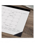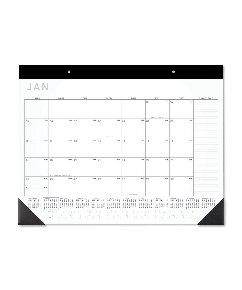 Contemporary desk pad features a fashion-forward color scheme and design elements. Monthly protection for your desktop with a full 12 months of planning. One month per page with unruled daily blocks to write in notes and reminders on each date. Extra writing space for priorities also included. Full year calendar reference on each monthly calendar page makes it easy to quickly look up dates. Desk pad pages are white with black top binding.