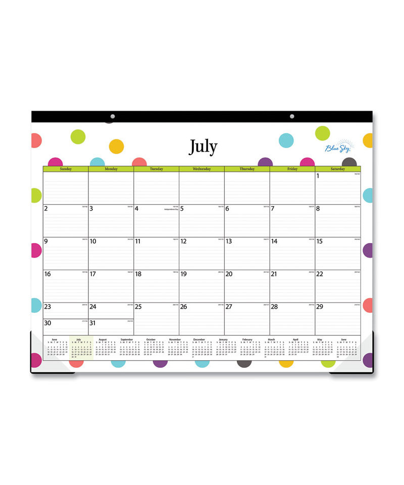 This desk pad academic year calendar is perfect for wall or desktop. Manage busy schedules by jotting down appointments, reminders and more. Design adds a touch of style while still offering ample writing space with clean white calendar grid. 13-month reference calendars run along the bottom. Thick, premium pages reduce ink bleed-through. Easy-to-tear perforated monthly pages. Clear corners keep pages flat. Printed on acid-free paper with soy-based ink. Mix and match with other planning products from Blue Sky to organize your daily life.