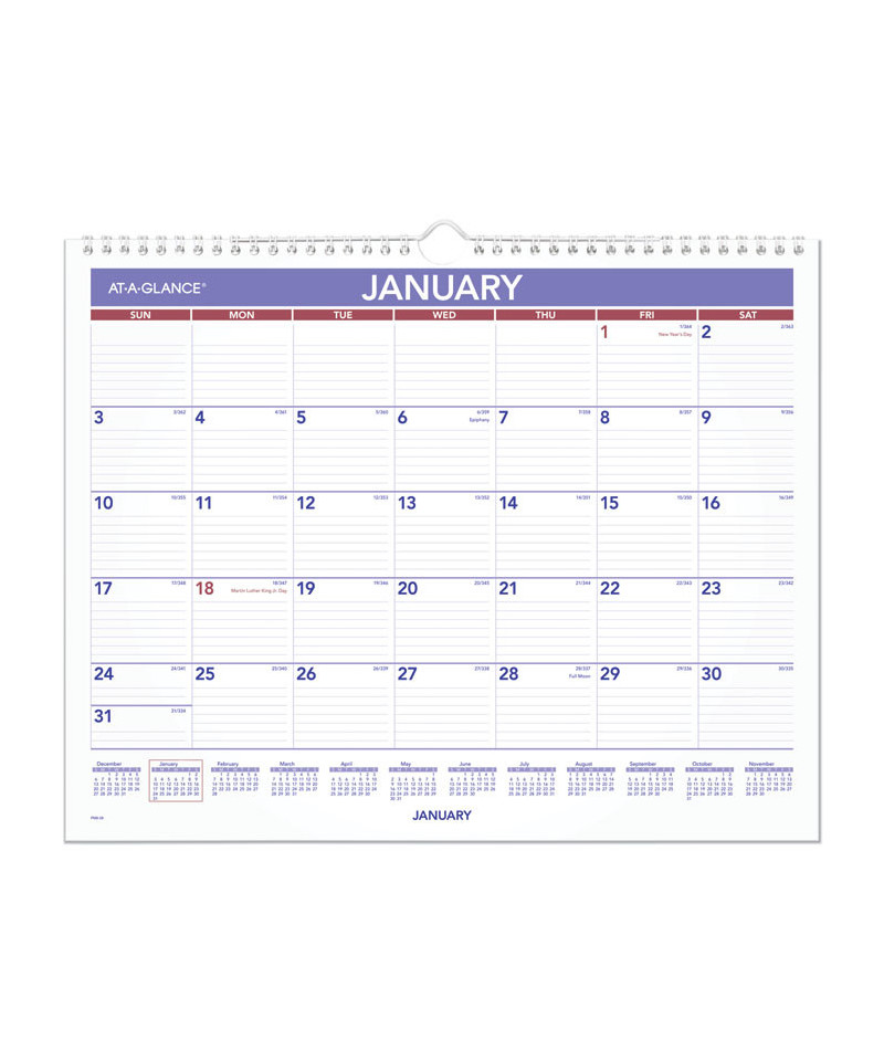 One month per page with ruled blocks. Full-year calendar reference; federal holidays highlighted. Bonus page: six months of future planning. Chipboard backing; wirebound with hanging loop. Printed on high-quality paper with superior ink bleed resistance..