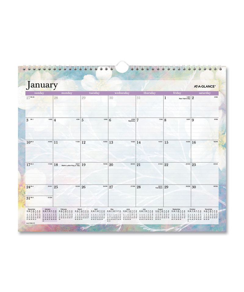 Keep track of key dates from birthdays to work deadlines. Soft, muted, ghosted-flower design on each page rotates quarterly to keep each season fresh and inspiring. Easy to follow, one month per page format features ruled daily blocks to keep your notes and reminders neat and easy to read. Full year calendar reference runs across the bottom of each monthly page, making it easy for you to stay several steps ahead. Wirebound across the top with a hanging loop for wall display. Printed on high-quality paper for superior ink-bleed resistance.
