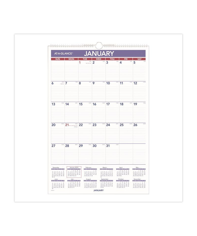 Write-on/wipe-off surface helps manage changes to schedules, events and reminders. One month per page design with ruled blocks helps keep your handwriting aligned and your notes easy to read. Wet erase marker included. Full-year calendar reference; federal holidays highlighted. Wirebound with hanging loop.