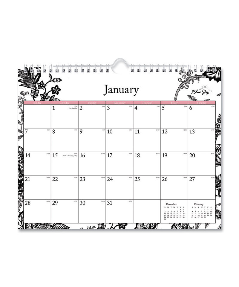 Spruce up your wall or work space while getting organized. Each page displays a different month for easy viewing of the dates ahead. Unruled daily blocks and thick premium pages prevent ink bleed-through. One page per month format includes Sunday through Saturday scheduling, count of days/days remaining, holidays and past and future months reference. Twin-wire binding features a sturdy, wall mount hook for secure hanging. Printed with soy-based ink on acid-free virgin paper. Dated January - December.