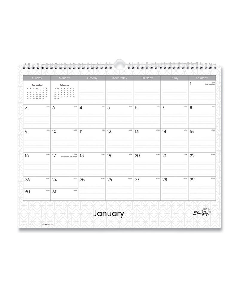 Say hello to ultimate organization in the Enterprise collection. The professional exterior you're looking for to match every work environment. This wall calendar offers a sturdy wall hook meant for hanging and twin-wire binding provides easy access to each month's plans. Past and future month calendar reference on each page. Ample writing space allows for plenty of opportunity for planning. Thick premium pages prevent ink bleed-through. Printed with soy-based ink on acid-free paper.