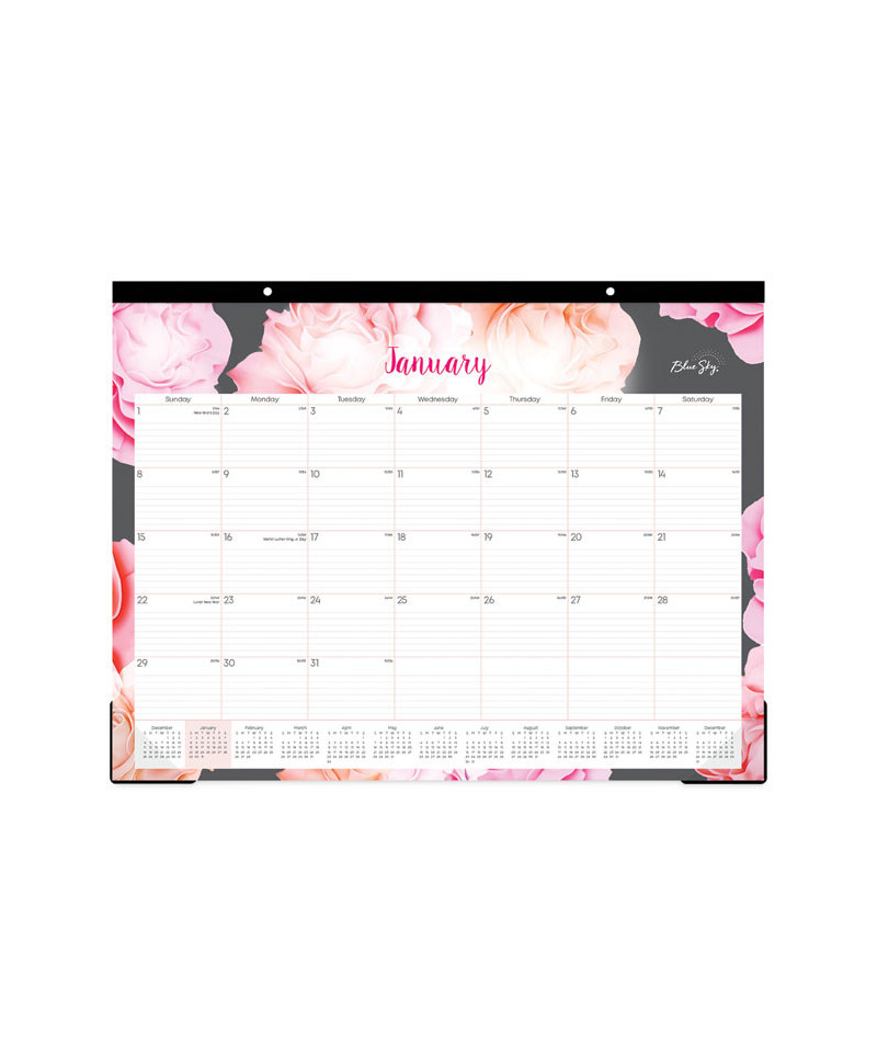Stylish monthly write-on calendar is perfect for wall or desktop and range 12 months from January to December. One page per month format includes ruled daily blocks, Sunday through Saturday scheduling, count of days/days remaining, holidays and past and future calendar reference blocks. Slim desk pad calendar is printed with soy based ink on thick, premium quality, acid free pages that reduce ink bleed-through. Clear corners keep pages flat. Easy-to-tear perforated monthly pages.