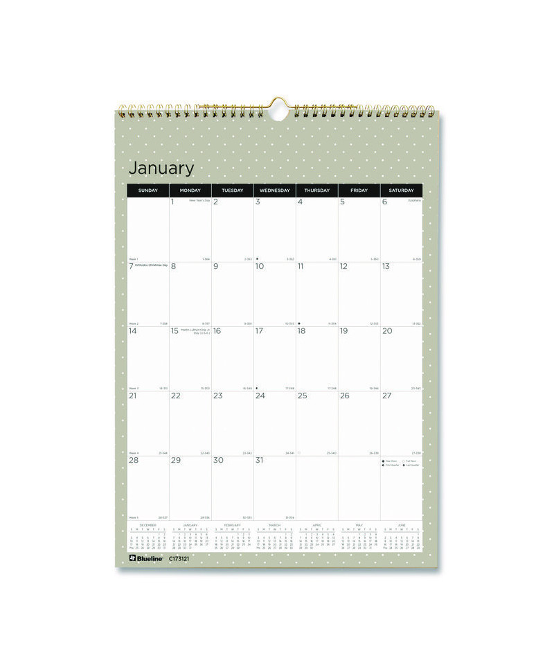 Colorful wall calendar with trendy Succulent Plants images that change every month. 12-month, January to December. One month per page and one block per day. Calendars of past and next month on each page. Features Special Dates and Events, Phase of the Moon and more for additional scheduling resources. Made with reinforced chipboard backer. Gold twin-wire binding and eyelet to suspend.
