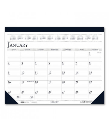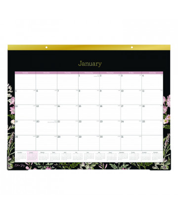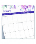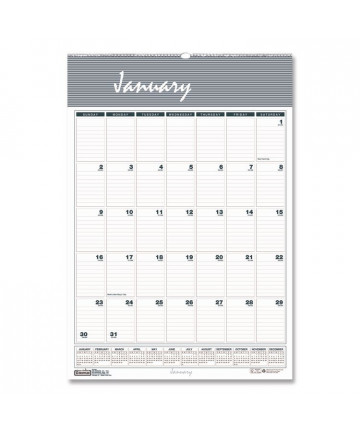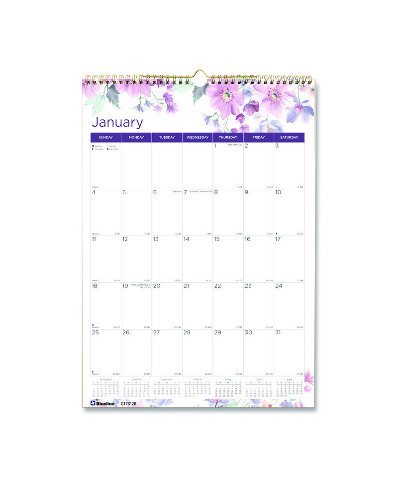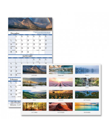 Colorful 12-month wall calendar, January to December. One month per page and one block per day. Calendars of past and next month on each page. Gold twin-wire binding with eyelet to suspend. Reinforced chipboard backer. Features important dates and events, Julian dates, and lunar phases.