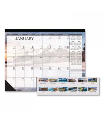 Brighten up your office with a unique, full-color panoramic garden scene photo for each month. Easy-fold, stand-up tent-card design is ideal where desktop space is limited. Strong, twin-wire binding keeps the pages firmly together, while making it easy to fold back each month's sheet without having to manipulate the tent-card stand. Major holidays listed. Printed on recycled paper with soy-based inks.