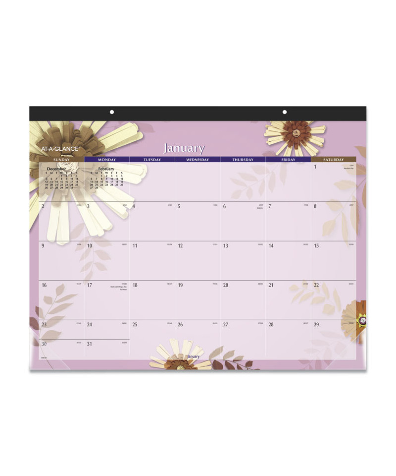 Features a new bright floral design each month. Durable backboard provides a sturdy writing surface. One month per page with unruled blocks. Past and future months reference. Black, wide paper headband with eyelets; two clear corners; perforated pages. The paper is colored, providing an attractive backdrop for the fun paper flowers design.