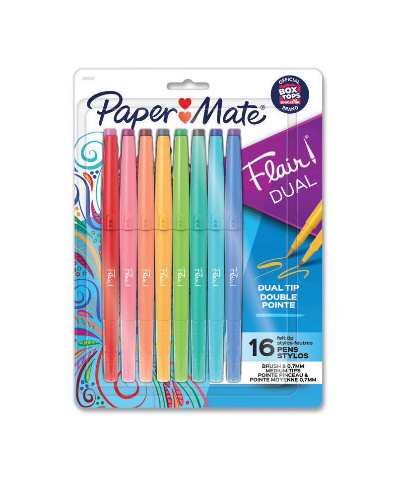 Double your creativity with Paper Mate® Flair Dual Pens! Dual-ended pens add an extra dimension to your note-taking, journaling, hand-lettering and more! On one end, a flexible brush tip helps you create a variety of line widths simply by changing pressure as you go. On the other end, a felt tip is perfect for writing and drawing finer, more precise lines. The full range of vivid, colorful inks are also smear-resistant, and the ink is specially formulated to eliminate the potential for bleed-through. Ensure your work looks its best when you choose Flair Dual!