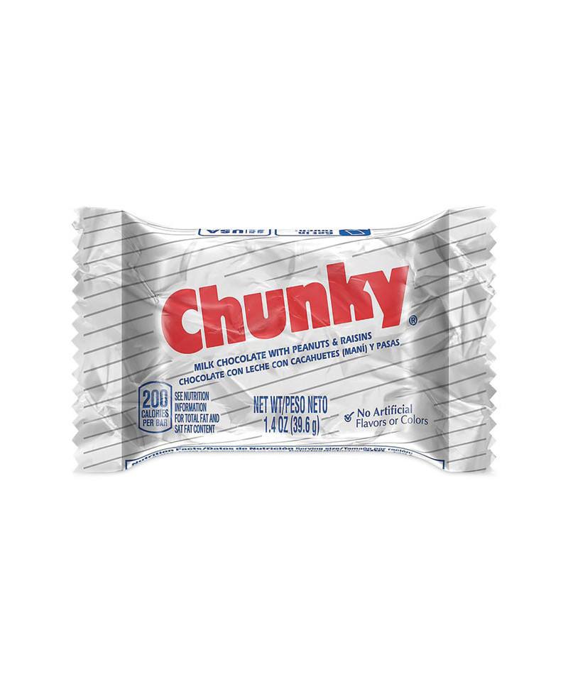 Don't reach for just any chocolate, take a walk down memory lane with a Chunky bar. With its distinctive thick trapezoid shape, this treat combines smooth milk chocolate, roasted peanuts, and raisins for an irresistibly unique flavor combination. Individually wrapped--perfect for party favors, or to stock the pantry for your chocolate cravings. Satisfy your sweet tooth, unwrap a Chunky Bar.