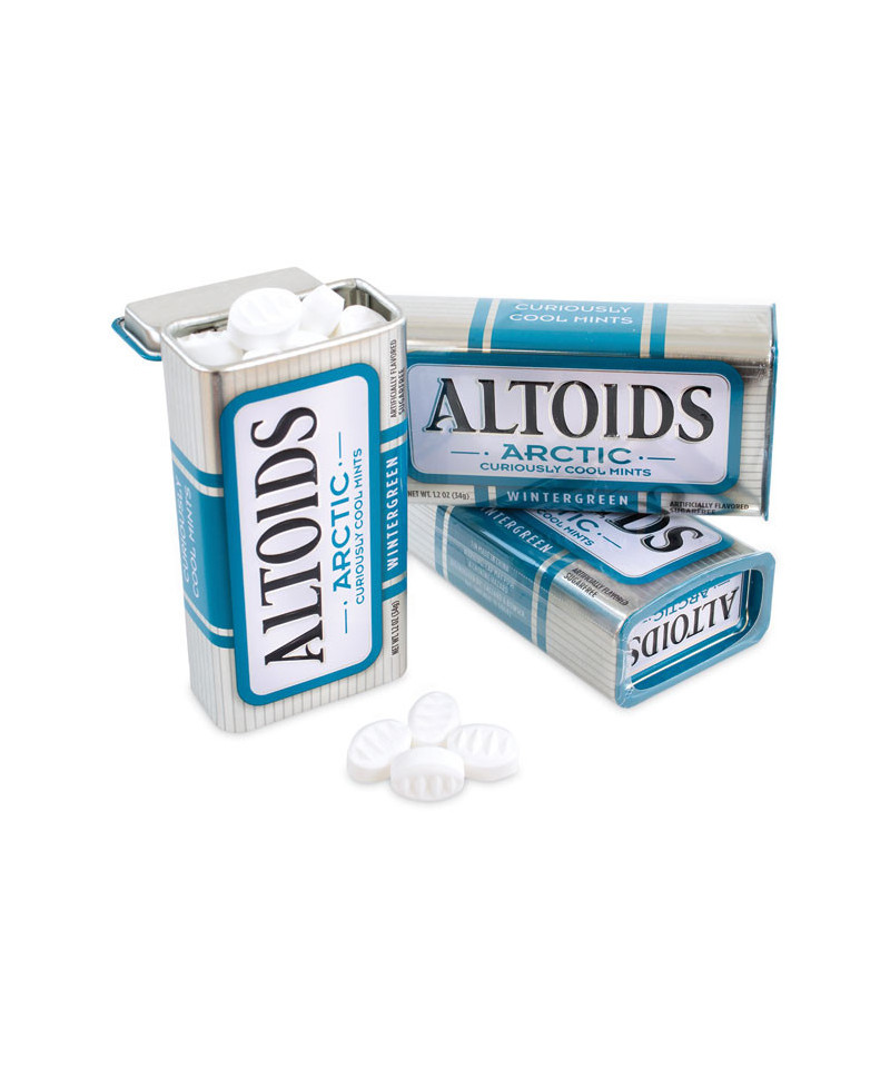 These curiously strong Altoids Arctic Wintergreen Mints pack a punch of wintergreen flavor! Open the tin of these Altoids mints and chew into the strong flavor for fresher breath. With eight recloseable tins, you'll have enough mints to last a long time. Keep a pack in your car, your desk, your purse, or anywhere you may need a quick breath freshener.