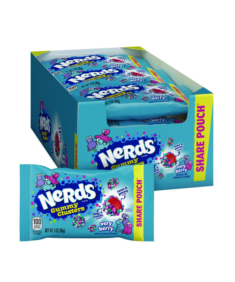 Berry yummy treats, poppable and sweet to eat. Nerds Gummy Clusters Very Berry has a taste that can't be beat. Every piece is a pure delight. Crunchy, gummy, yummy, the Very Berry bite. Nerds surround fruity, gummy centers. Those sweet little sparks are fantastic inventors. A poppable cluster, packed with tangy, crunchy Nerds. A candy so tasty, there aren't even words.