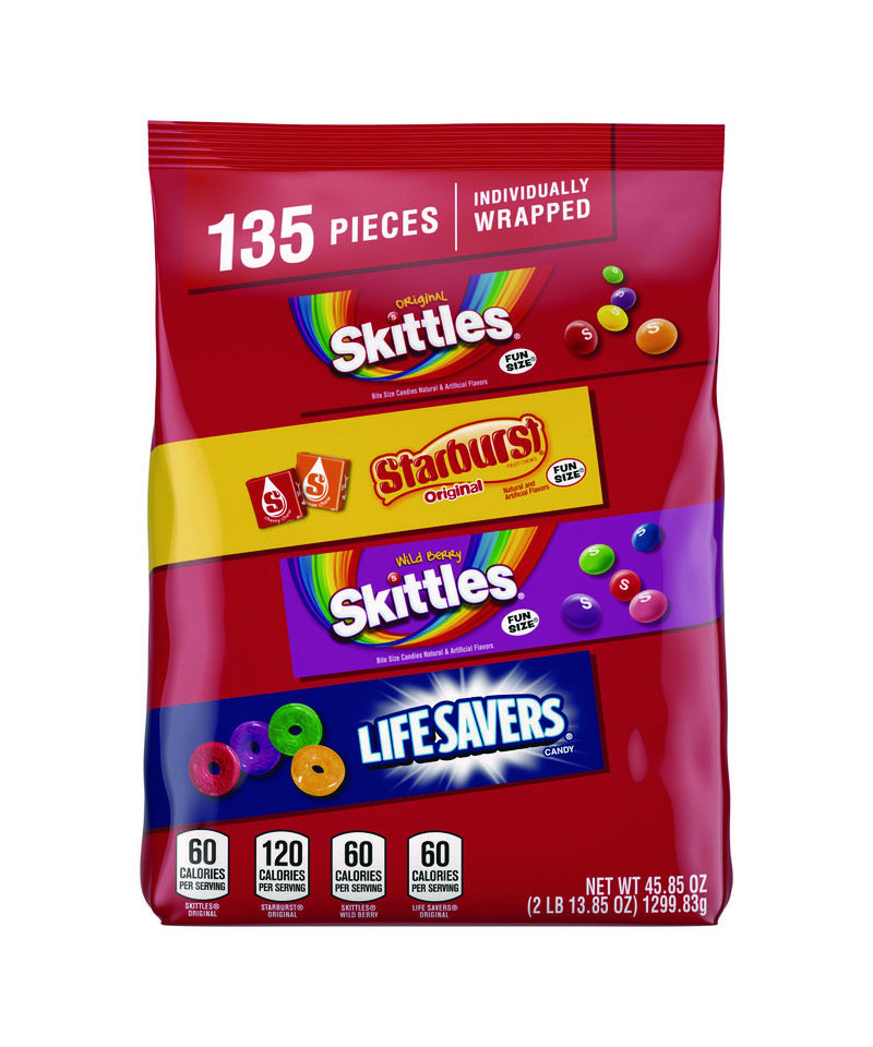 Give your tastebuds a mouth-watering experience with this bulk bag of chewy and hard candy. Stick your hand in this candy bag full of individually wrapped pieces of Skittles Original and Skittles Wild Berry Chewy Candy, Starburst Chewy Candy, and Life Savers Hard Candy.