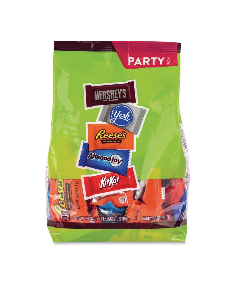 A stand-up bag assortment of snack-sized Hershey®'s Mini Milk Chocolate Bars, York® Dark Chocolate Peppermint Patties, Reese's® Peanut Butter Cups, Almond Joy®s, and Milk Chocolate Kit Kats®. Whether you're in the mood for minty dark chocolate, crispy milk chocolate wafers, peanut butter or just pure chocolate this bag has something for everyone. Bring to your next holiday party or pack in the kids' lunches for a surprise they'll love!