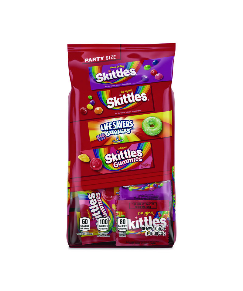 Can't choose between chewy or gummy candy? Now you don't have to with this Mars Skittles, Skittles Gummies, and Life Savers gummies party-size variety bag full of mouth-watering fruity candy. Make celebrations extra-sweet by filling your candy buffets, party favors, and pinatas with individually wrapped gummy and chewy fruit-flavored candy. Guests will be smiling ear to ear thanks to this yummy fruit-flavored assortment. Are you in charge of office snacks? Increase team morale by filling up the office candy dish with this bulk bag of candy. Eliminate those afternoon slumps and let Skittles and Life Savers turn those frowns upside down.
