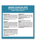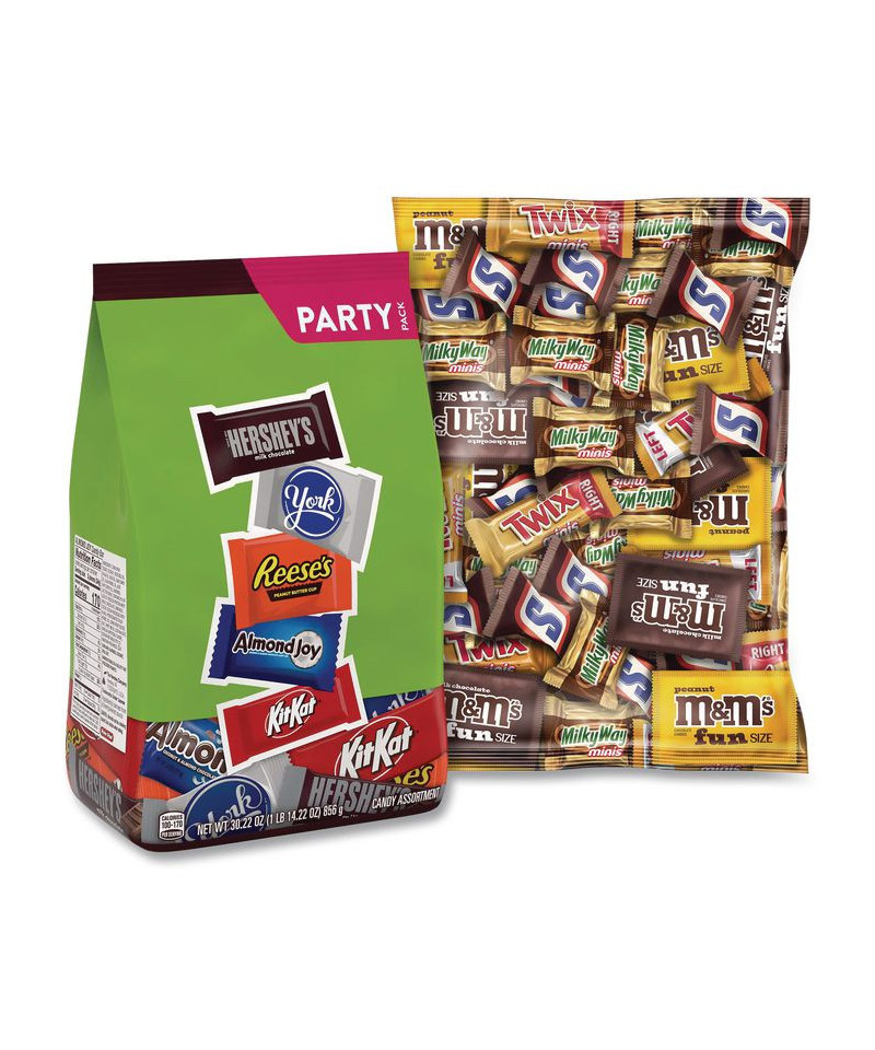 This two bag pack includes a Party Pack Stand Up Bag Milk Chocolate Assortment of Reese's, Almond Joy, Kit Kat and York Patties and MARS Chocolate Favorites Assorted Variety of mini Milky Way, Snickers, TWIX and fun size M&Ms. They offer the perfect variety to satisfy your sweet tooth. Whether you're in the mood for minty dark chocolate, crispy milk chocolate wafers, caramel, nougat, peanut butter or just pure chocolate, this variety pack has something for everyone. Bring these chocolate favorites to your next party, fill up the candy dish, stash it in your desk drawer or pack in the kids' lunches for a surprise they'll love!