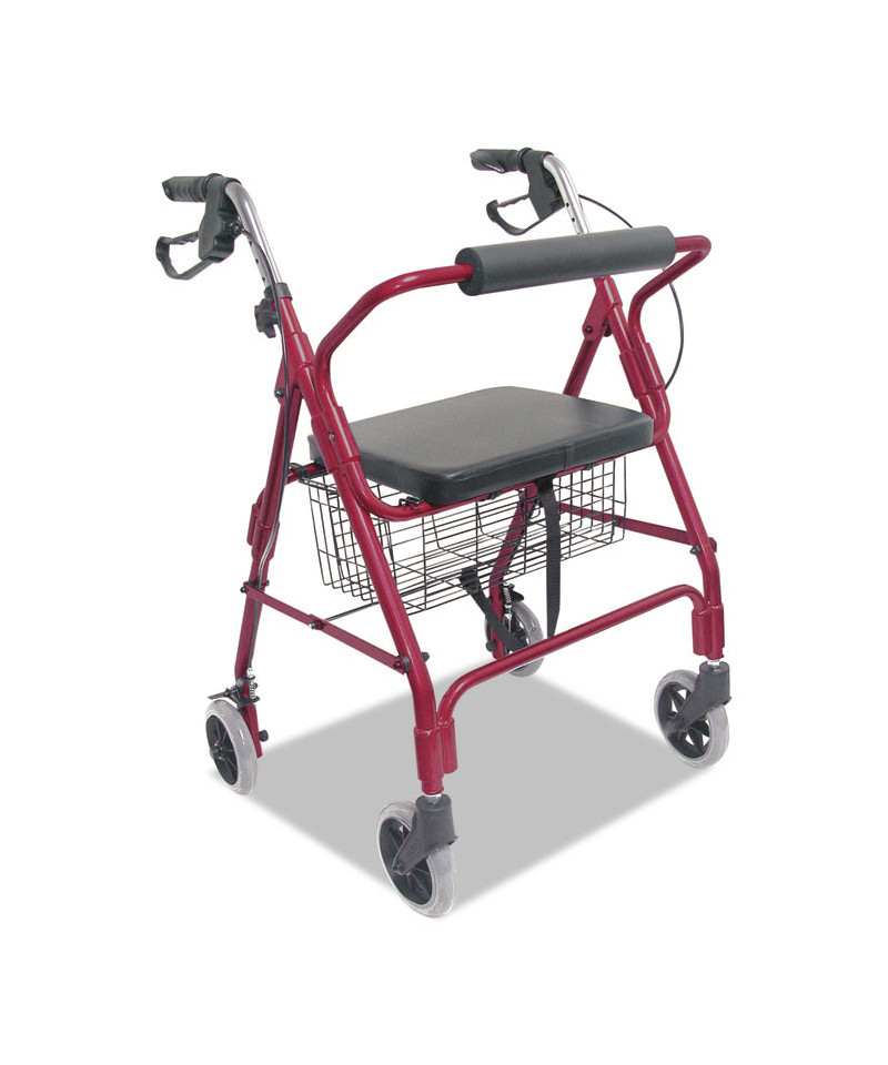 Sturdy rollator/walker with padded seat and straight, padded, backrest provides comfort whenever you need a break. Bicycle-style, loop-lock handbrakes for added control. Rollator folds for storage and transportation. Adjustable handle height for added user comfort; adjusts from 33.75" to 38" in 1" increments. Two-position wire storage basket provides an easy method for carrying purses, bags and any other supplies you might need. Convenient flip-up seat cushion provides easy access to storage basket.