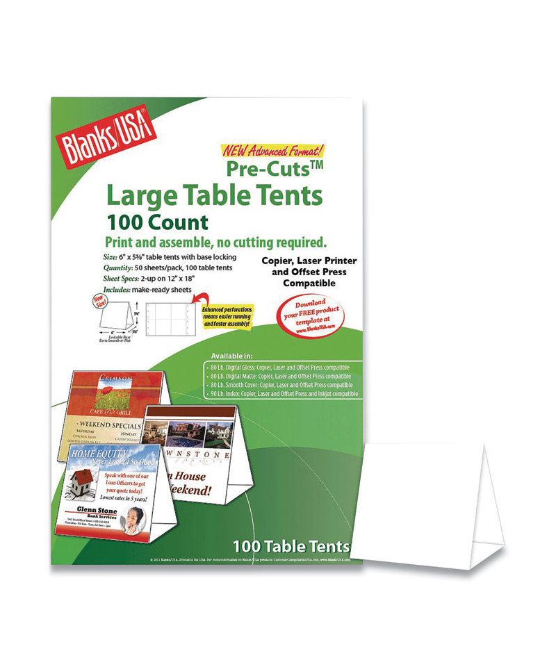 Create an upstanding impression with digital table tents. Crisp folds along the score lines and interlocking tabs make this sturdy product stand up. These digital table tents are designed for printing on digital equipment. Print one sheet at a time, or multiple and take advantage of the pre-micro-perforated sheets which make the table tents easy to separate.