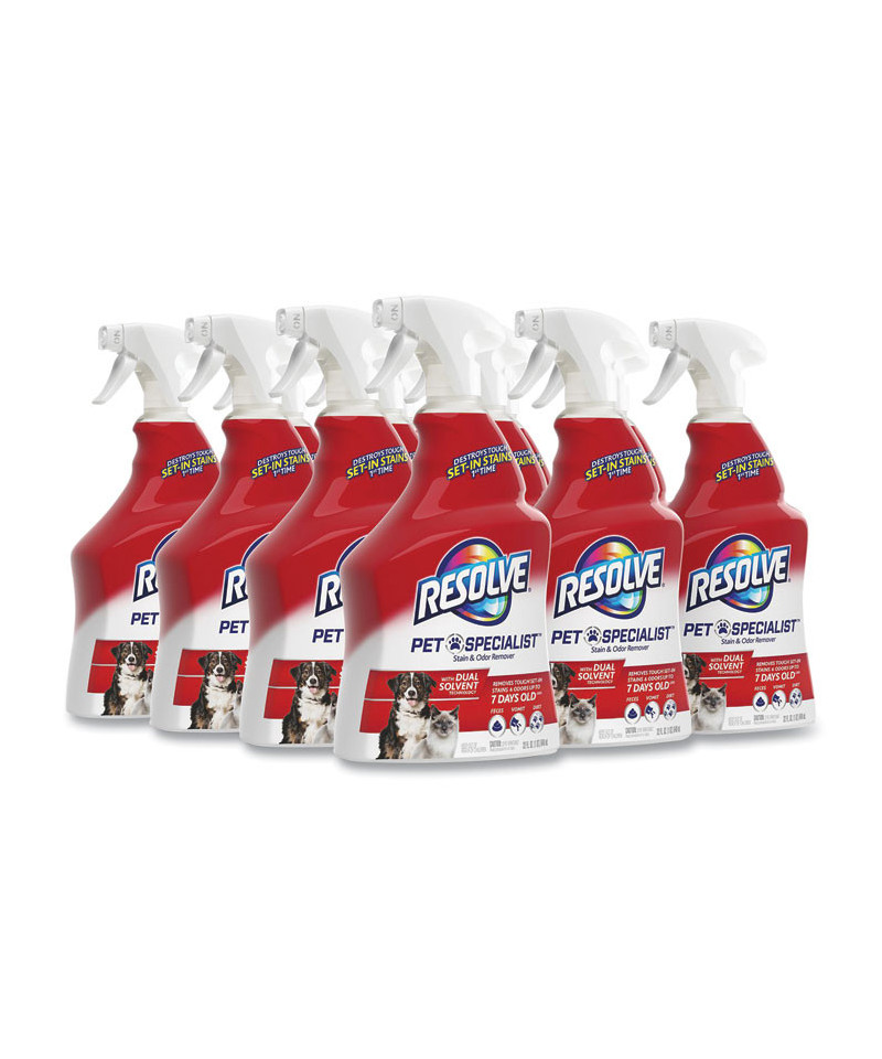RESOLVE® Pet Specialist™ Stain & Odor Remover lifts and removes tough set-in stains like feces, vomit, dirt and their odors up to seven days old. Also prevents remarking by neutralizing odors. It's safe for use around pets when used as directed. This formula makes carpet, floor and upholstery cleaning super easy! It destroys tough set-in stains the first time and it is safe to use on most carpet, rug, upholstery, hard surface floors and car interiors.