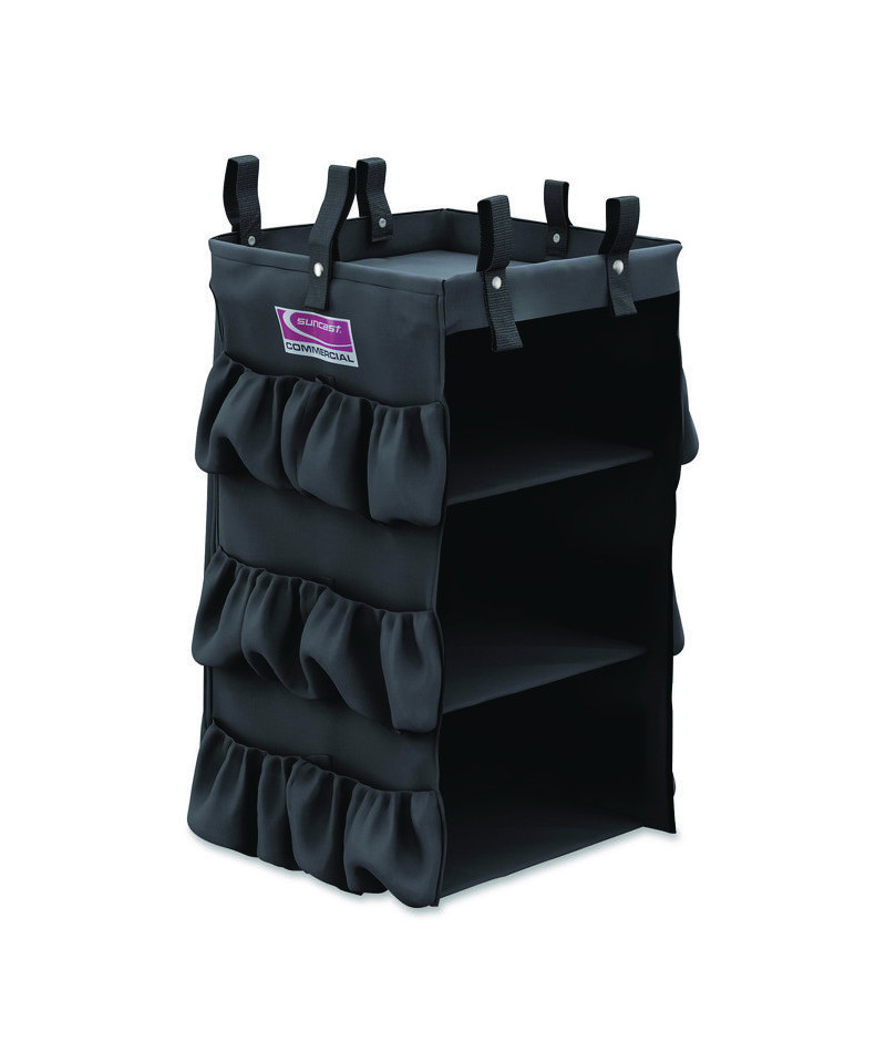 The 3-Sided Hanging Bag with Shelves by Suncast Commercial® is an additional bag to attach to the handle of your cart. This bag features three spacious shelves for more versatile storage solutions, as well as exterior pockets for smaller items. This bag attaches to either side of the Suncast Commercial® HKC1000 and HKC2000 to increase efficiency in the workplace!