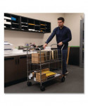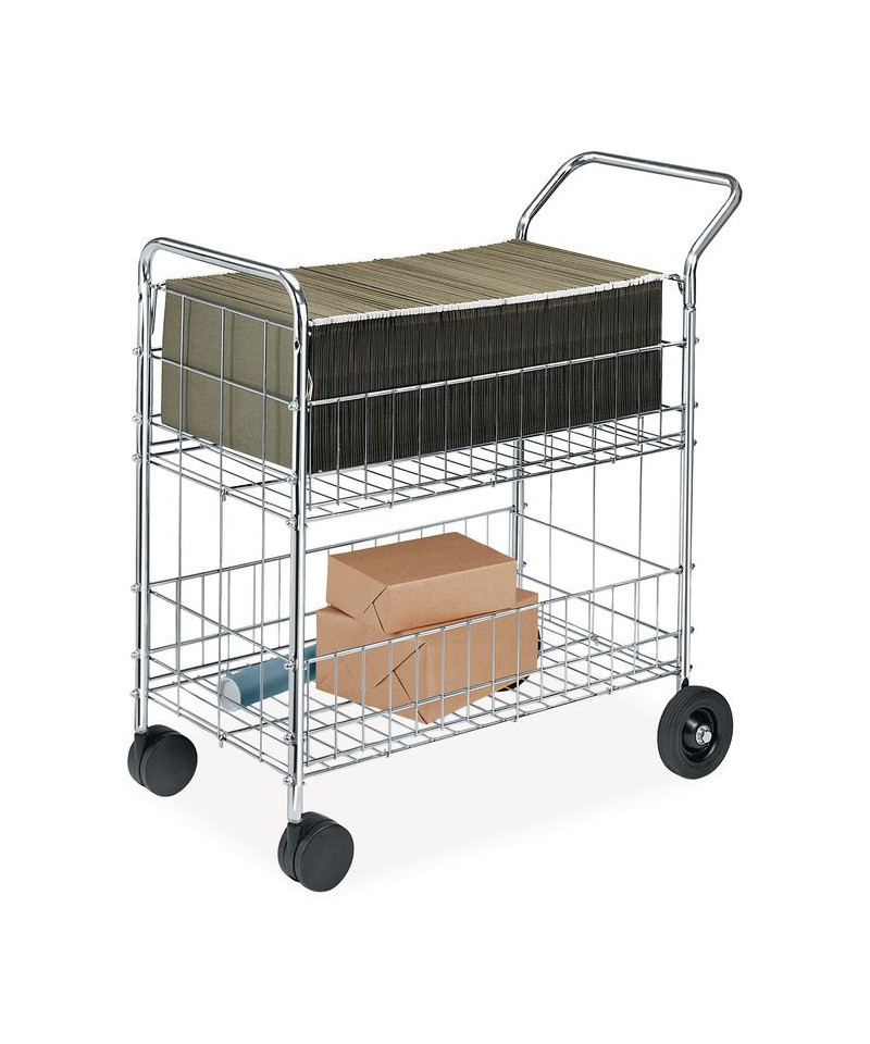 Fellows wire mail cart is Ideal for moving files and delivering mail. Top basket with adjustable guides holds up to 150 letter or legal size files. Bottom shelf for bulk mail or packages. Twin-wheel front casters and large rear wheels. Chrome-plated steel wire construction. 200 lb capacity. Look for other coordinating office products by Fellowes to make your workday easier.