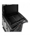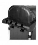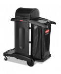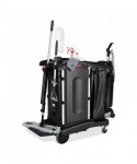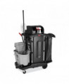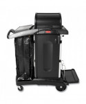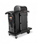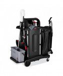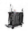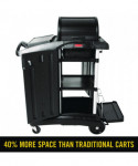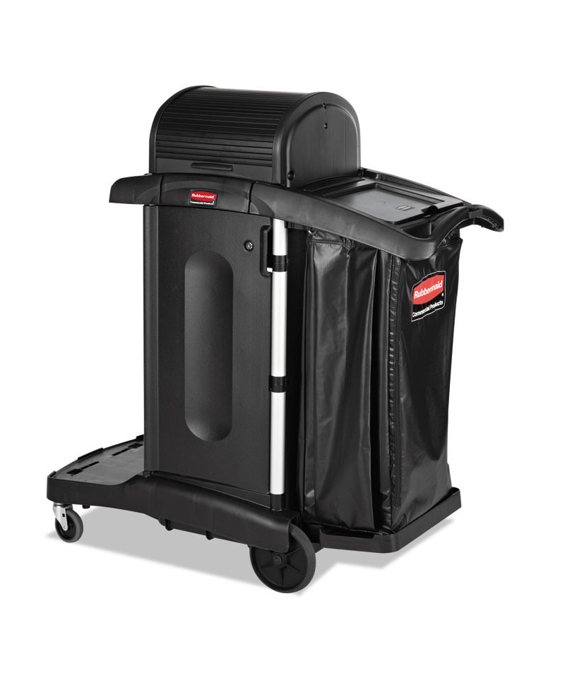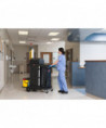 Select a janitorial cart with strength and security as well as an attractive appearance. Pre-assembled locking hood and doors provide additional security. Spacious cart provides plenty of storage - up to 7.25 cubic feet of space, with removable bins and caddies. Its compact size allows it to fit in constrained spaces. Durable 8" ball bearing wheels and quiet 4" casters. Interchangeable handles and removable platform. Mop bucket platform with securing grooves keeps WaveBrake® or microfiber charging buckets securely attached to cart. Rubber tool grips hold up to 5 stick goods; hooks hold up to 4 safety signs.