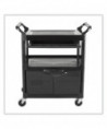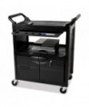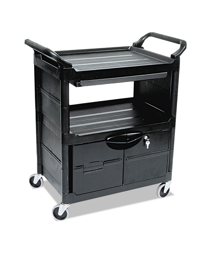 The all-plastic construction make this wheel cart durable and easy to maintain. Like many Rubbermaid utility carts, this unit features easy to grip handles for simple maneuverability. A 200-pound weight limit makes it ideal for many applications. Lockable doors provide security when needed, while side and back panels on this rolling utility cart conceal contents. A sliding drawer easily stores smaller items.
