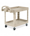 This utility cart is perfect for transporting materials, supplies, and heavy loads in almost any environment. Ergonomically-designed push handle provides optimum hand placement and push height, improving control and worker safety. Molded-in storage compartments, holsters, hooks and notches for ideal storage. The rolling utility cart features molded-in customizable fittings. High-density structural resin construction. Easy-access bottom shelf. Best-in-class casters to meet the most demanding environments.