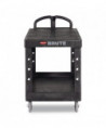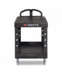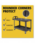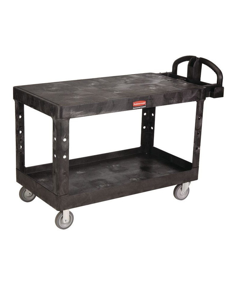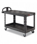 This utility cart is perfect for transporting materials, supplies, and heavy loads in almost any environment. Ergonomically-designed push handle provides optimum hand placement and push height, improving control and worker safety. Molded-in storage compartments, holsters, hooks and notches for ideal storage. The rolling utility cart features molded-in customizable fittings. High-density structural resin construction. Easy-access bottom shelf. Best-in-class casters to meet the most demanding environments.