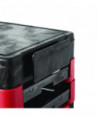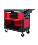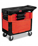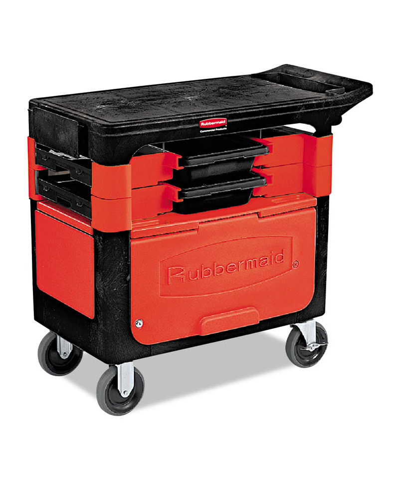 The Rubbermaid Commercial Rolling Tool Chest moves productivity right to the work site with a total tool storage and mobile workbench system. The portable tool cart has a flat surface at a user-friendly height which provides a stable work area. Four compartmentalized boxes store assorted parts and hardware. Two storage bins hold essential hand tools and supplies. Rolling tool cart moves easily over hard surfaces, through elevators and doorways.