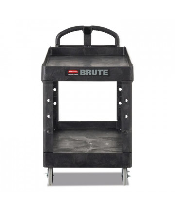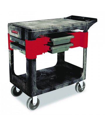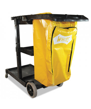 The Rubbermaid Commercial Utility Cart with Zippered Yellow Bag collects waste and transports tools efficiently on 8" non-marking wheels and 4" casters. This versatile utility cart has 3 lipped shelves, and a zippered yellow vinyl bag for collecting refuse or launderable items. The surface of the top shelf features tool grips for keeping frequently used items at hand wherever this service cart travels.