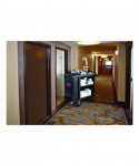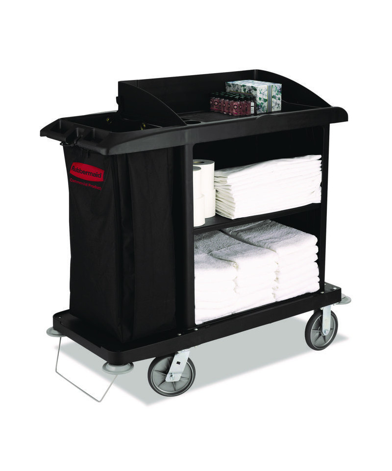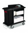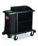 Cart with zippered yellow bag collects waste and transports tools for efficient cleaning.